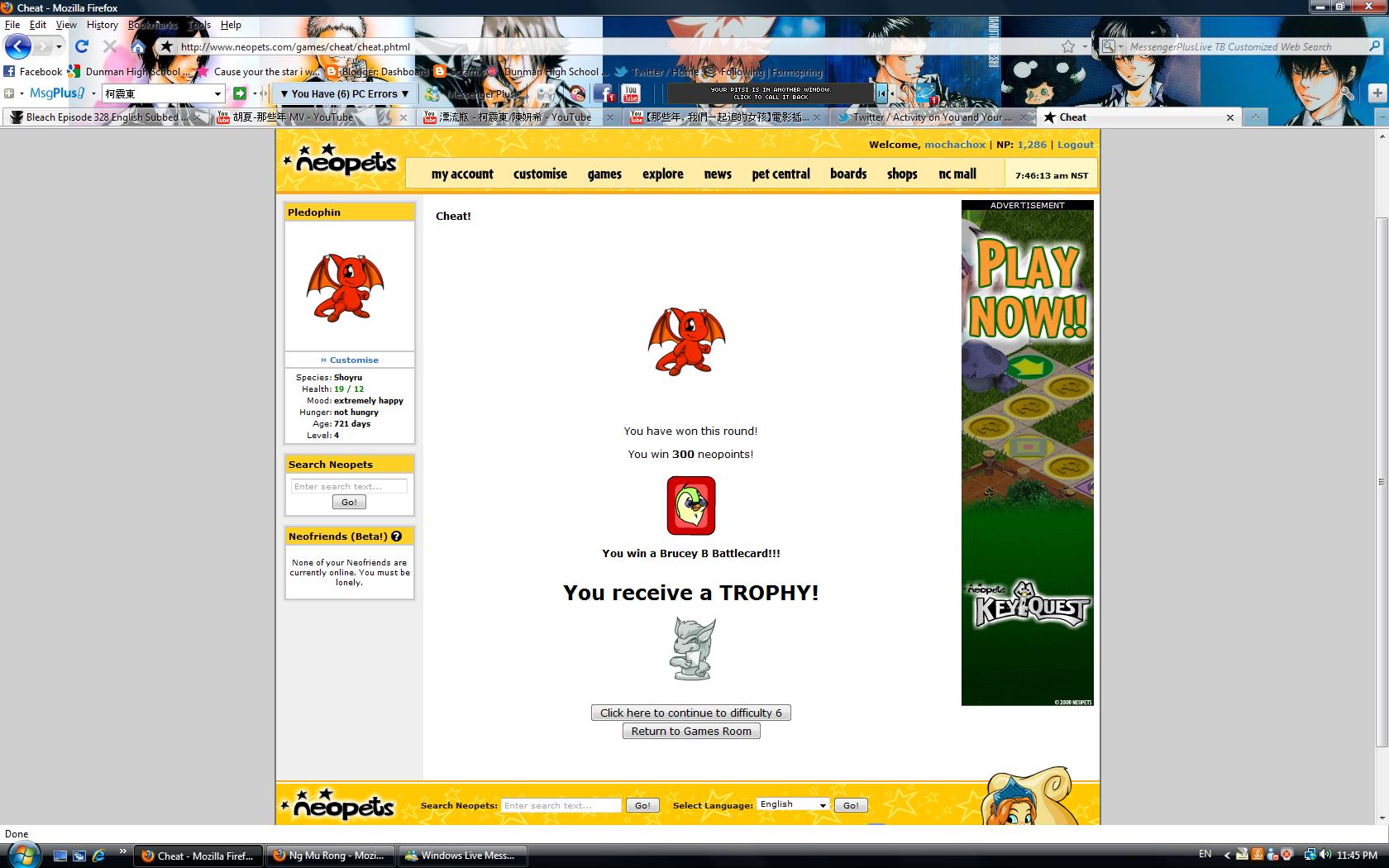 I even got a million brucey b's battlecard and whatsmore, a damn trophy! LOL. I repeat, i got into level 7 then i was too tired, hence i forgot to take a screenshot to portray my awesome skills in cheat for neopets. Heh :) Note that my neopets is extremely happy and not hungry,which means i take good care of my pet. The only pet i've taken care of is a goldfish irl, and it refused to eat lol so it died. SEE i told you i took good care of pets.